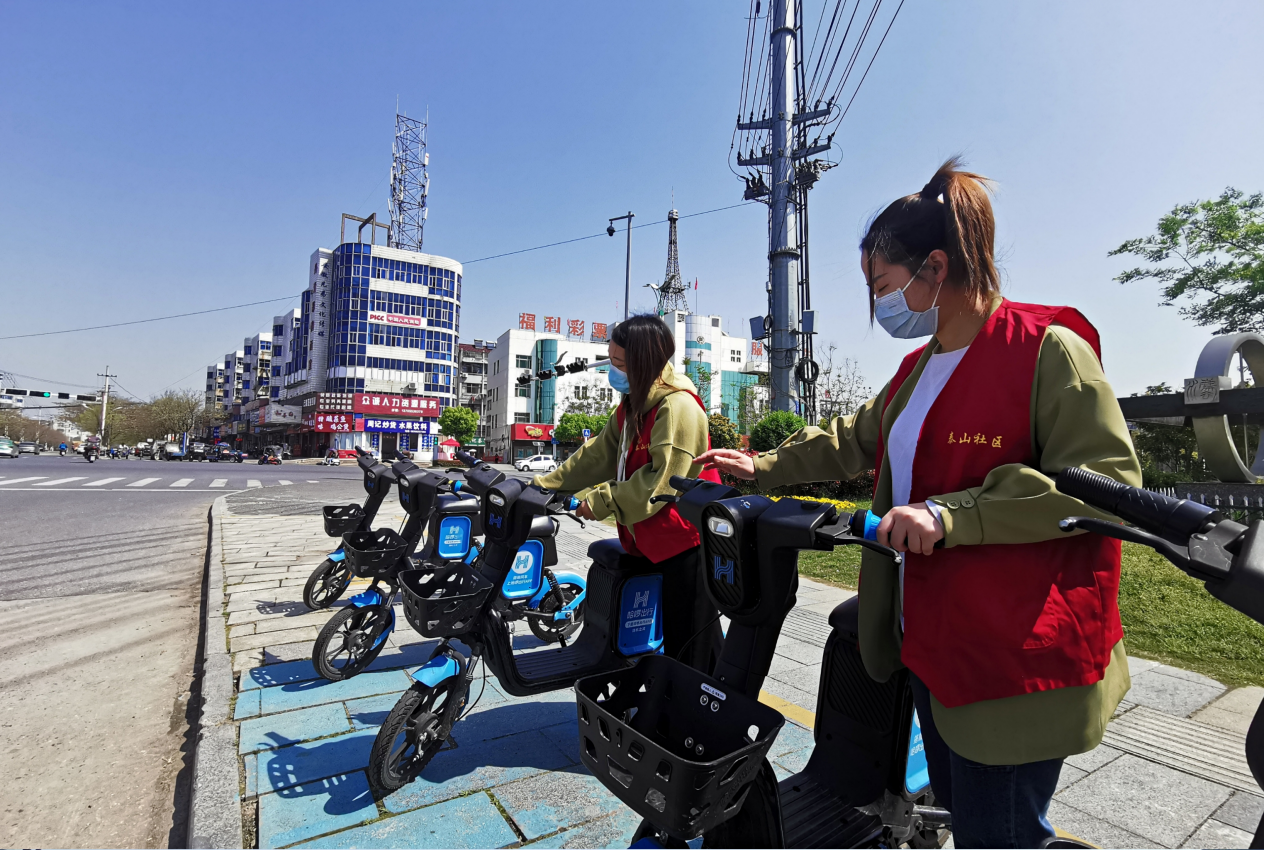 圖為泰山社區(qū)志愿者將停放不當(dāng)?shù)墓蚕韱诬?chē)歸位