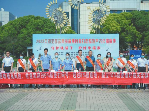 為認(rèn)真貫徹落實(shí)《防范和處置非法集資條例》有關(guān)要求,加大《條例》普法和防非宣傳力度,增強(qiáng)人民群眾對(duì)非法集資的防范意識(shí)和能力,2022年6月15日,無(wú)為市地方金融監(jiān)督管理局聯(lián)合人行無(wú)為支行,組織市監(jiān)局、中行無(wú)為支行、無(wú)為農(nóng)商行和國(guó)元、華安證券等單位,在人民廣場(chǎng)開展了以“守住錢袋子,護(hù)好幸福家”為主題的防范和處置非法集資宣傳活動(dòng)。