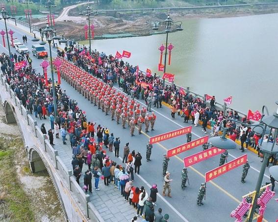 歡送儀式前,無為市人武部組織新兵繞城巡游。兩名騎警、一輛軍車,車頭掛著大紅花在最前方開道,隨后是鑼鼓隊奏唱,百余名新兵身著嶄新迷彩服,佩戴光榮花,昂首挺胸、精神抖擻,呈4列隊形緊跟其后。行進中,他們以軍禮向父老鄉(xiāng)親致意,另一輛軍車在隊伍后方壓陣。現(xiàn)場氣氛熱烈,數(shù)千群眾手持橫幅,自發(fā)跟隨巡游隊伍,歡送新兵入伍、踏上強軍征程。