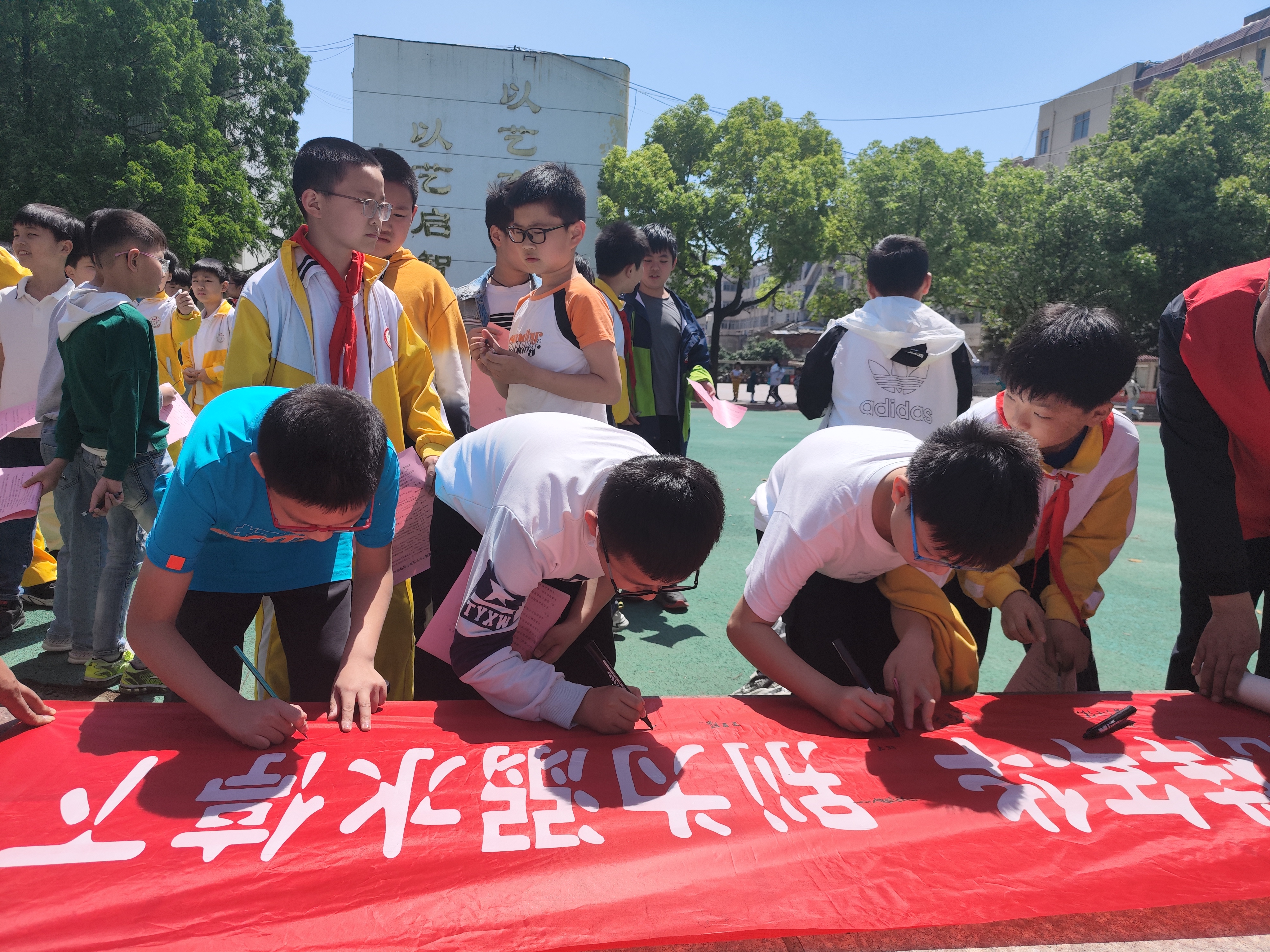 同時文景社區(qū)志愿者以安全知識問答的形式,提問小朋友對緊急自救技能的了解,小朋友們踴躍搶答志愿者提出的問題,在愉快的活動氛圍中加強了安全防范能力。最后小朋友們齊聚操場,排好隊依次在紅色宣傳橫幅上鄭重地簽下了自己對于防溺水的承諾和決心。