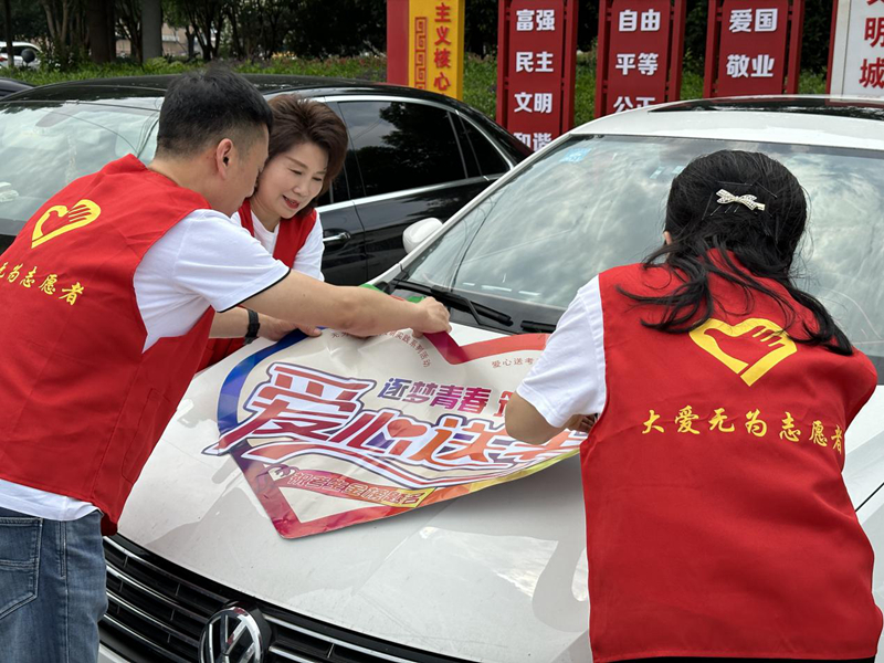 圖為大愛無為協(xié)會愛心車隊志愿者張貼“愛心送考”車貼