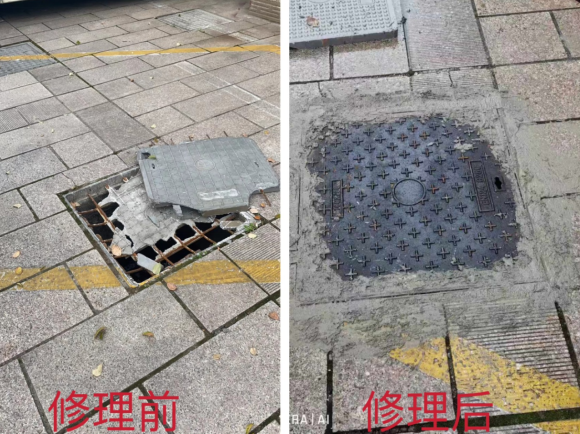 接到消息后,社區(qū)第一時間安排小區(qū)網(wǎng)格員到現(xiàn)場查看,趕到現(xiàn)場后,網(wǎng)格員確實發(fā)現(xiàn)井蓋破損嚴(yán)重,一多半已經(jīng)陷落進(jìn)井口。為避免破損井蓋給過往居民及車輛造成不便,引發(fā)安全事故,網(wǎng)格員及時聯(lián)系專業(yè)維修人員,很快維修人員就來到現(xiàn)場對破損井蓋進(jìn)行搶修,并換上了新的井蓋,消除了安全隱患。隨后社區(qū)還安排人員對沿線以及小區(qū)里面的其他窨井蓋進(jìn)行檢查,發(fā)現(xiàn)一處要立即維修一處,確保小區(qū)居民出入安全。