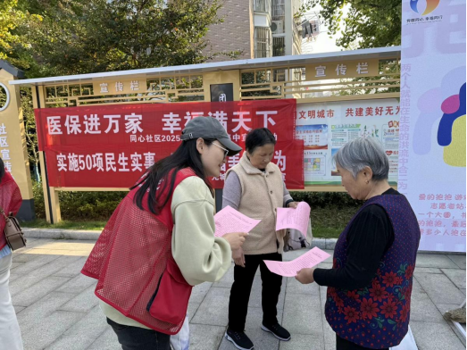 圖為同心社區(qū)網(wǎng)格員在小區(qū)內(nèi)向居民宣傳民生實(shí)事50項(xiàng)