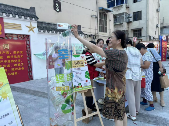 現(xiàn)場(chǎng)的“以書換蔬”“以塑換蔬”區(qū)域人氣十足。居民將早早準(zhǔn)備好的空塑料瓶依次投遞進(jìn)“空瓶回收終結(jié)站”,志愿者根據(jù)瓶子數(shù)量遞上對(duì)應(yīng)的蔬菜兌換積分卡,漸漸的塑料瓶裝滿了回收站,更有居民帶著自家孫兒一起前來(lái)投遞塑料瓶,“空瓶正好放在家里沒用了哩,能回收利用也是我們給地球環(huán)境出份力了?!?/p>