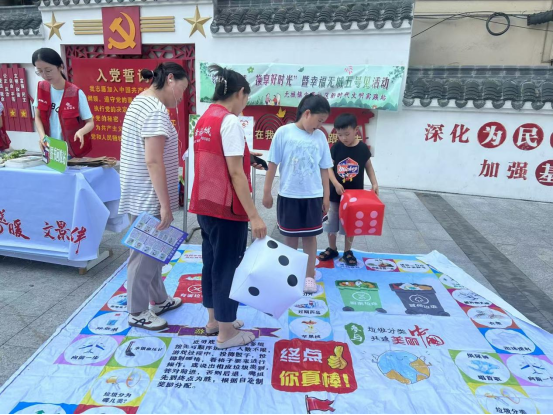 垃圾分類飛行棋區(qū)域更是深受小朋友們歡迎,他們站在印了垃圾分類知識(shí)的棋盤畫上拋骰子,通過(guò)拋出的點(diǎn)數(shù)前往下一關(guān)進(jìn)行知識(shí)闖關(guān),答對(duì)了的穩(wěn)步前進(jìn),答錯(cuò)的耐心聽志愿者講解,在一問(wèn)一答一講中深化環(huán)保知識(shí)。