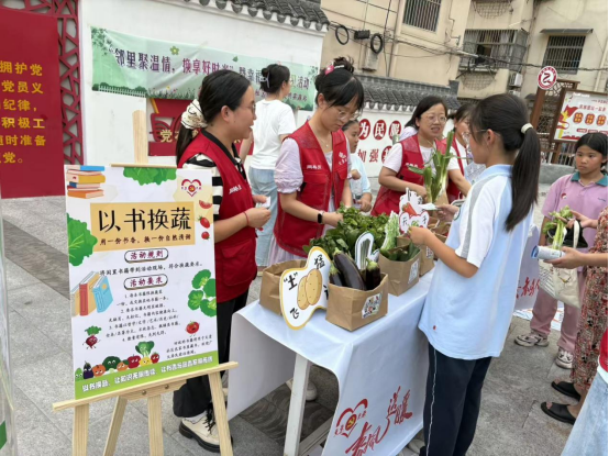 圖書中轉(zhuǎn)站前,不少居民拿著家中閑置的書籍前來(lái)兌換,“這幾本書家里小孩看完就閑置了,拿來(lái)兌換綠色蔬菜正好。”