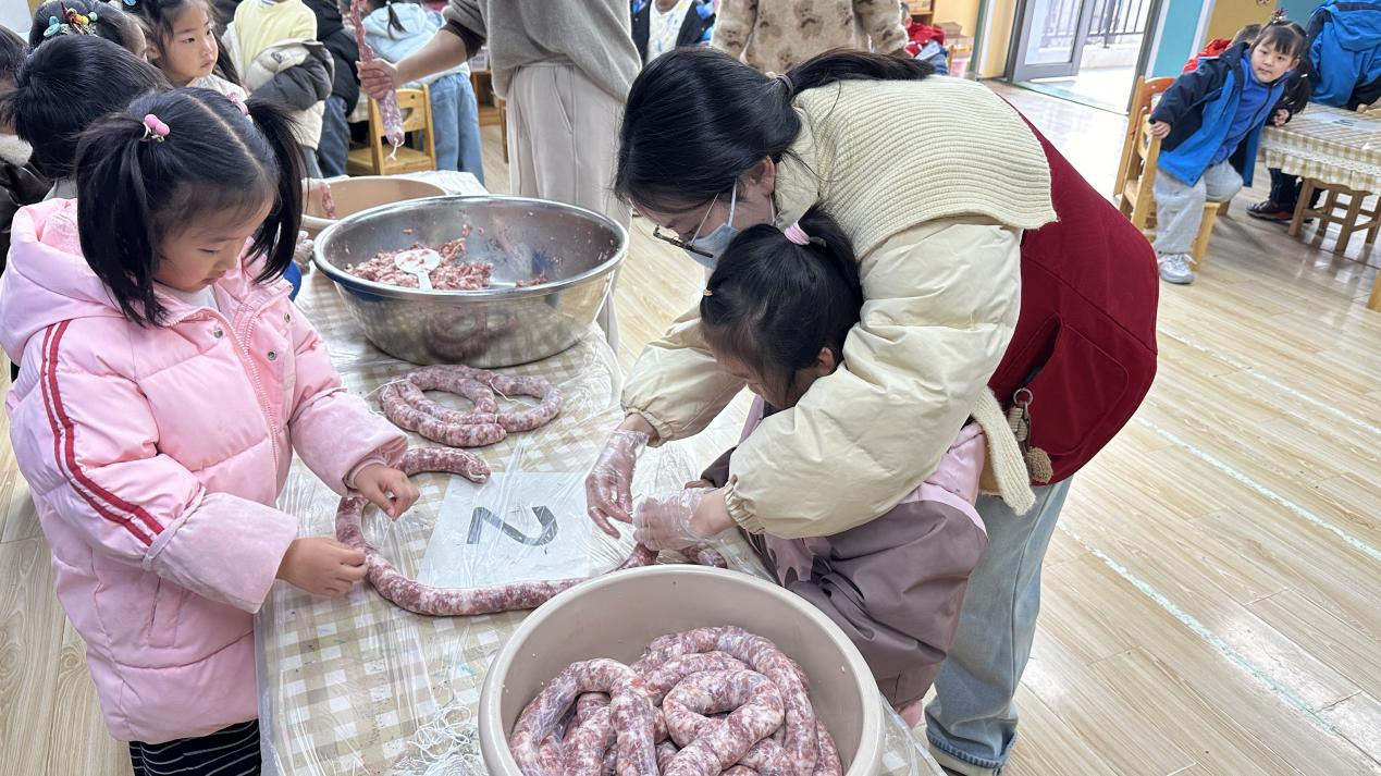 活動(dòng)開始前,社區(qū)工作人員與幼兒園老師提前備好新鮮食材,從講解冬至習(xí)俗入手,拉近孩子們與傳統(tǒng)節(jié)氣的距離。隨后,老師耐心示范香腸的制作步驟,社區(qū)工作人員則分組來到小朋友身邊,手把手指導(dǎo)操作——從稱量鮮肉、攪拌調(diào)味,到學(xué)習(xí)灌腸技巧、系繩分段,每一個(gè)環(huán)節(jié)都充滿童趣。孩子們握著工具,跟著步驟嘗試,雖然動(dòng)作略顯笨拙,手上也沾了肉末,但臉上始終洋溢著興奮的笑容。