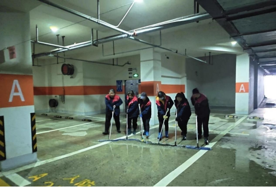 行動中,大家分工協(xié)作、干勁十足,重點對小區(qū)地下室停車場地面、排水溝、車位線周邊進行全面清掃,同時擦拭消火栓、指示牌等設(shè)施表面的污漬。針對車輛往來留下的輪胎印、油漬,工作人員使用專用清潔劑反復(fù)擦洗,確保地面干凈整潔。