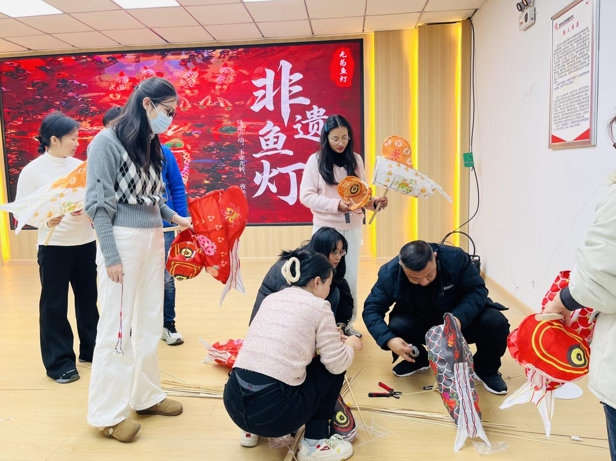 “無為魚燈”起源于安徽無為,于2011年被列入國家級非物質(zhì)文化遺產(chǎn)名錄。課堂之上,氛圍熱烈而有序,蔣章先生先以千年魚燈的歷史淵源開篇,從北宋進獻宮廷的佳話講到“紅燈一繞,祈福納祥”的民俗傳統(tǒng),再到描繪“鳳簫聲動,玉壺光轉(zhuǎn),一夜魚龍舞”的詩詞意境,將無為魚燈承載的民生期盼與文化基因娓娓道來。理論講解完畢,實操環(huán)節(jié)緊鑼密鼓展開。竹篾彎折需剛?cè)岵?,蒙紙定型要細致入微,從魚身架構(gòu)到魚尾弧度,從魚鰭雕琢到魚頭塑形,蔣章先生手把手示范要領(lǐng),糾正學(xué)員動作偏差;學(xué)員們凝神專注,或度量尺寸或穿插編織或裱糊蒙皮,從生疏試探到嫻熟操作,指尖翻飛間,一根根竹篾宛轉(zhuǎn)成型,一張張“魚皮”賦予靈性。當(dāng)燈光嵌入骨架,一盞盞造型靈動的魚燈次第點亮,光影流轉(zhuǎn)中,傳統(tǒng)技藝與青春活力碰撞出耀眼火花。