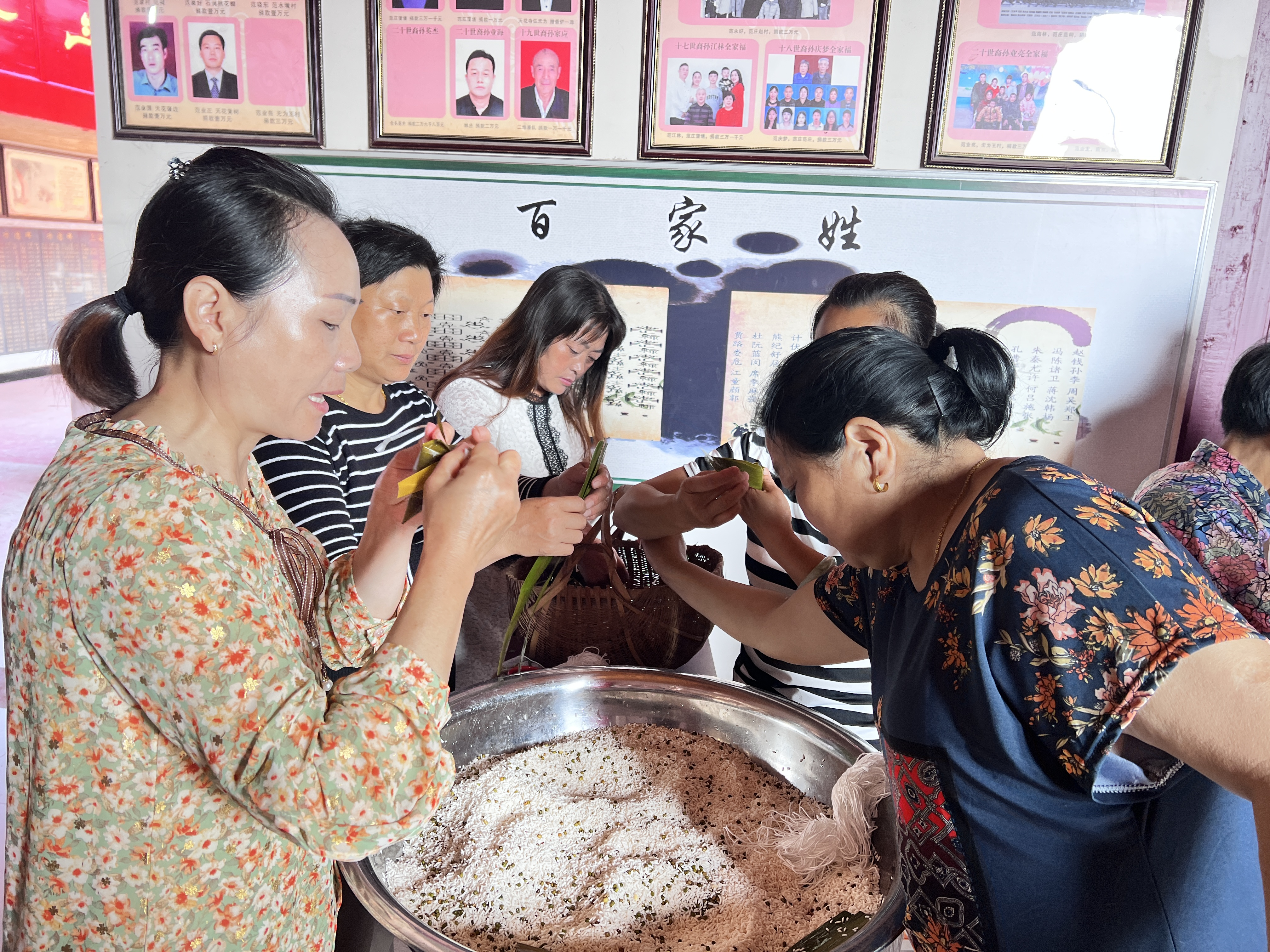 范莊村志愿者將提前準備好的糯米、綠豆、粽葉、粽線等材料擺放到已就位參賽人員的桌子上,大家圍在一起相互討論著粽子的包法和不同的形狀。此次活動共分為四組進行比賽,每組十人。