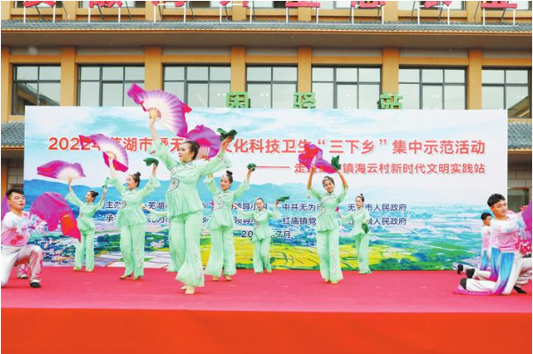 幸福的花鼓打起來,精彩的戲曲聯(lián)唱和起來,明快的歌伴舞表演跳起來、激奮人心的紅色故事講起來……在“三下鄉(xiāng)”活動的舞臺上,由蕪湖市藝術(shù)劇院藝術(shù)團(tuán)、無為市委宣傳部等單位帶來的好節(jié)目輪番上演,大家伙看得目不轉(zhuǎn)睛、叫好連連?!斑@個京劇唱得地道,黃梅戲有韻味,廬劇表演爐火純青,比我在電視上看到的還要精彩呢!”62歲的村民陳大爺搖著蒲扇聽著戲開心地說道。