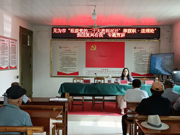 為迎接黨的二十大勝利召開,營造團(tuán)結(jié)奮斗、自信自強(qiáng)“強(qiáng)國復(fù)興有我”的濃厚氛圍。2022年8月29日,無為市“迎接黨的二十大勝利召開‘舉旗幟·送理論’強(qiáng)國復(fù)興有我”專題宣講會在劉渡鎮(zhèn)慶豐村部新時代文明實(shí)踐站舉辦。無為市委黨校電教中心主任肖亞暉圍繞“以無悔奮斗書寫新時代華章”主題展開一場生動的宣講會。