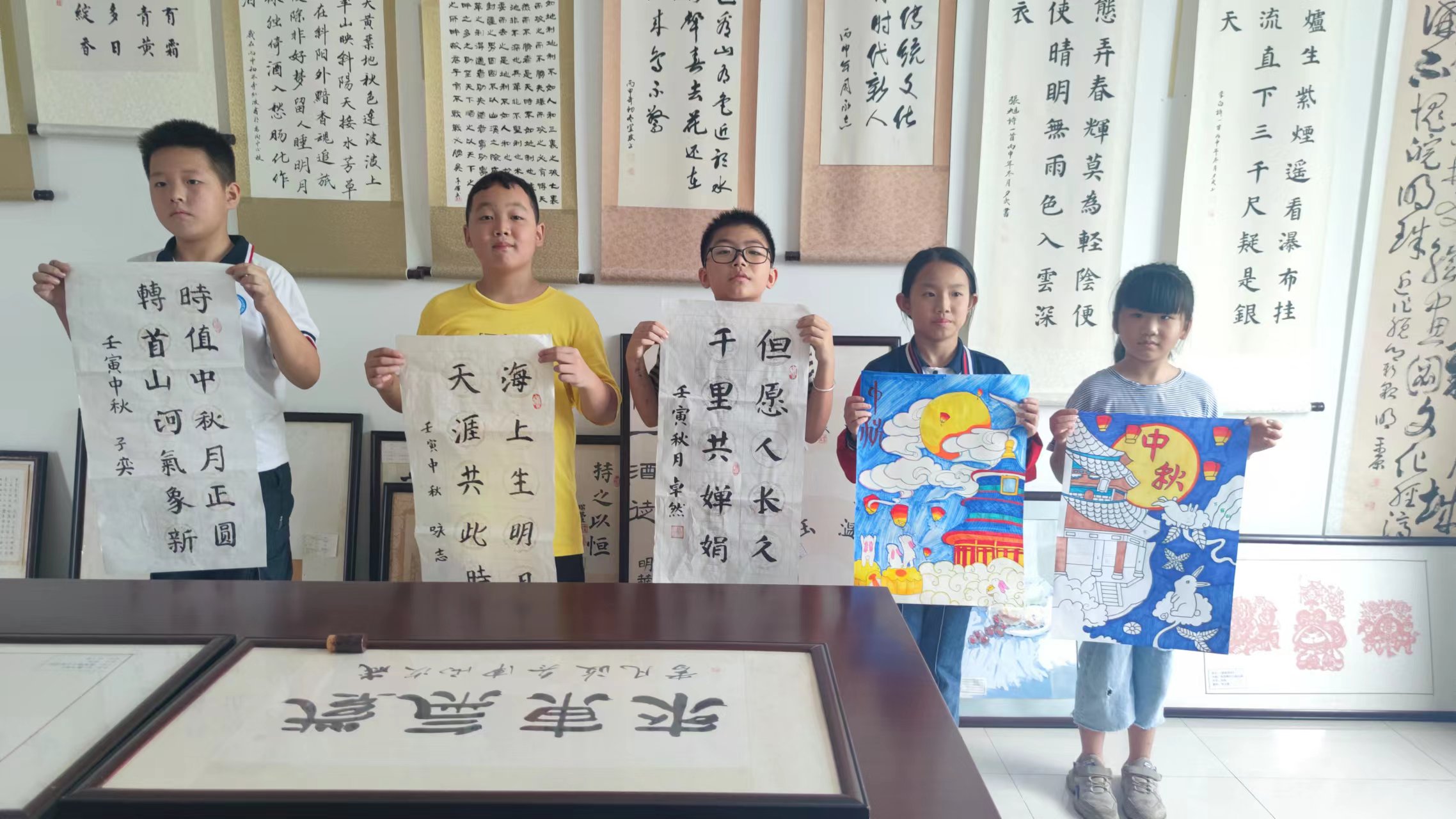 隨后,為了進(jìn)一步激發(fā)孩子們對(duì)中華傳統(tǒng)節(jié)日的愛(ài),讓他們創(chuàng)作出自己心中的中秋主題繪畫、書法作品,同時(shí)講述自己作品的含義。一個(gè)寫了“海上生明月,天涯共此時(shí)”書法作品的小朋友說(shuō)道,“這句話就像說(shuō),雖然這個(gè)中秋我和爸爸不能團(tuán)聚,但是我們都看著一個(gè)月亮就像在一起一樣?!贝蠹覍?duì)此感慨頗深?;顒?dòng)最后,孩子們共同展示了自己的作品。