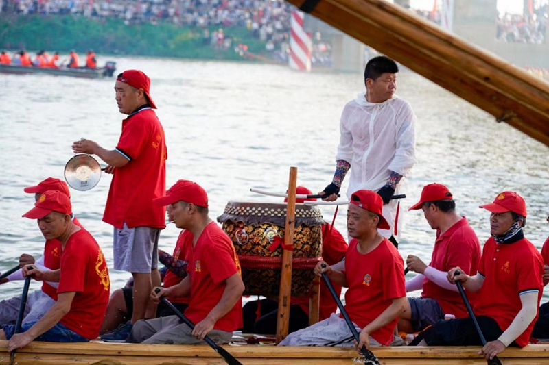 賽龍舟是一項(xiàng)古老的傳統(tǒng)體育活動(dòng),也是中國的非物質(zhì)文化遺產(chǎn)之一。這項(xiàng)活動(dòng)不僅考驗(yàn)參與者的體力和團(tuán)隊(duì)合作精神,也具有濃厚的文化內(nèi)涵。裕溪河水面上,上百條龍舟排列整齊,整裝待發(fā),一人一槳、一張一弛、一心一意,同步劃槳、默契協(xié)作,這是智慧與體能的比拼、團(tuán)隊(duì)與團(tuán)隊(duì)的戰(zhàn)斗、堅(jiān)韌與退縮的角逐。水面上不僅有年壯氣銳的男子漢駕駛龍舟,還有不讓須眉的巾幗英雄比拼鳳船。百舸爭流,奮楫者先;千帆競發(fā),勇進(jìn)者勝,五公里的水道,隊(duì)員們相互支持、相互配合,共同追求最佳表現(xiàn)。