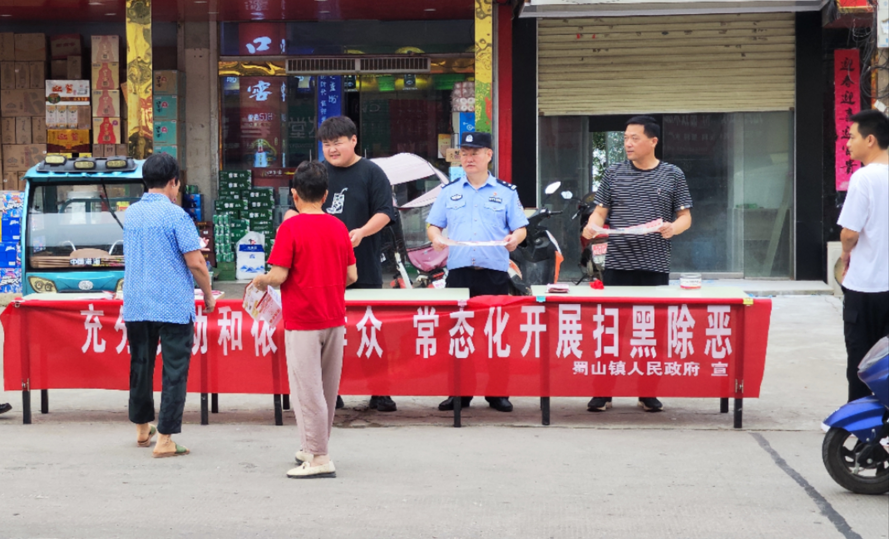 為進(jìn)一步推進(jìn)常態(tài)化掃黑除惡斗爭(zhēng),增強(qiáng)人民群眾防范黑惡犯罪的意識(shí)和能力。2023年7月14日上午蜀山鎮(zhèn)綜治辦聯(lián)合轄區(qū)派出所等部門聯(lián)合開(kāi)展了“充分發(fā)動(dòng)和依靠群眾,常態(tài)化開(kāi)展掃黑除惡”為主題的宣傳活動(dòng)。