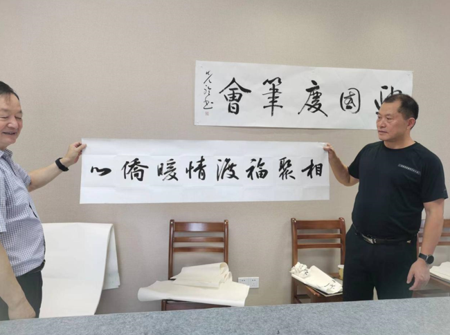活動現(xiàn)場,志愿者為在場僑胞科普了中秋習俗的由來,為大家送上了節(jié)日的問候與祝福,大家暢所欲言,一聲問候,兩句細語,現(xiàn)場洋溢著濃濃的情意。同時,福渡鎮(zhèn)邀請多位書法家開展中華經典誦讀、中秋詩文朗誦,并通過書法交流的方式表達對中秋、對中華傳統(tǒng)節(jié)日的理解和感悟,為各位僑胞送上節(jié)日贈語。