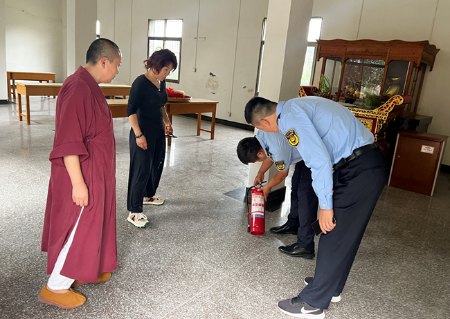 檢查中,檢查人員以查、看、聽方式對宗教活動場所內殿堂、廚房、僧舍等可能存在火災隱患的場所和角落進行全面細致的檢查,重點檢查滅火器是否保持完好和能否有效使用,寺廟內是否存在電線老化、線路裸露等情況進行檢查。