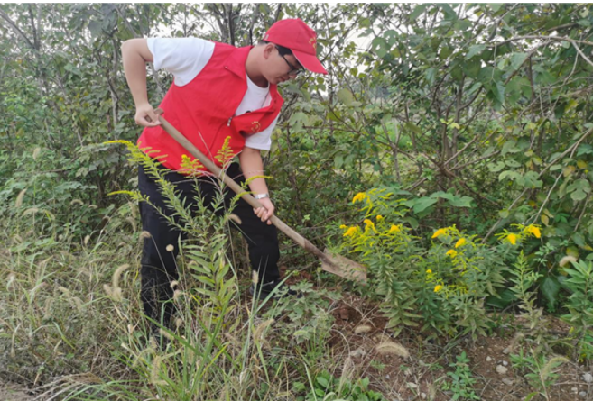 在通過鏟除翻耕、割草機割除等方式開展集中清理后,泉塘社區(qū)一枝黃花連片發(fā)生區(qū)域的防除工作已獲得顯著成效,但零星地區(qū)還存在“漏網(wǎng)之魚”。身穿“紅馬甲”的志愿者們來到泉塘社區(qū)祈雨路,分為四支“鏟花”小分隊,有序清理道路兩側(cè)的“黃花”。大家手持鋤頭、鐵鍬和鐮刀等工具,發(fā)揚不怕苦、不怕累的精神,將道路兩側(cè)的一株株“黃花”連根拔起,并及時收集清運,做到發(fā)現(xiàn)一株、鏟除清理一株,防止宿根再生,確保防除效果。