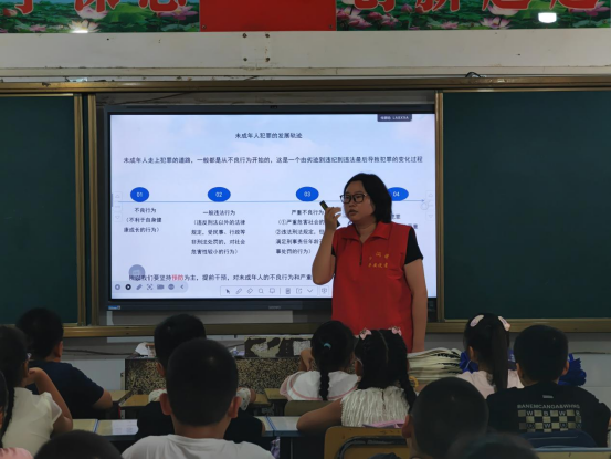 課堂上,工作人員結(jié)合學(xué)生的年齡層次與認(rèn)知能力,以 “案例故事+互動(dòng)問(wèn)答”的形式分析未成年人犯罪的現(xiàn)狀、原因以及預(yù)防措施,鼓勵(lì)同學(xué)們?cè)谛睦锓N下一顆“守法”的小種子,今后不管是在校園里和同學(xué)相處,還是在生活中遇到陌生情況,做事之前“問(wèn)一問(wèn)”法律法規(guī)——這樣做是否符合規(guī)定?然后勇敢又堅(jiān)定地與不良行為說(shuō)“不”,努力做一名懂規(guī)矩、守法律的陽(yáng)光好少年!