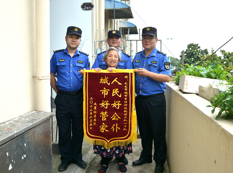 “趙隊長,汪隊長,你們快進來坐!真的太感謝你們了,聯(lián)系了那么多部門都沒解決,就抱著試試看的心態(tài)找了你們,你們真的幫我解決好了。你們不是親人勝似親人,真的是人民的好公仆!”家住藍天小區(qū)2棟87歲的谷奶奶,一見市城管局中隊長趙國慶等人的面,就連聲道謝,拉著趙國慶的手,拿出了準備好的印著“城市好管家、人民好公仆”字樣的錦旗,堅持要趙國慶收下。趙國慶連稱這是城管人應該做的,當不得這樣稱贊。