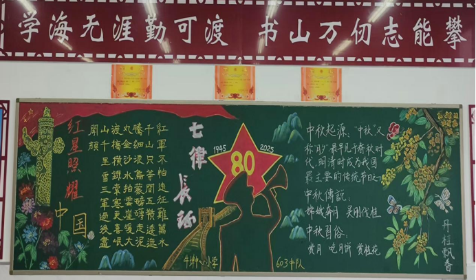 校園里的黑板報成了一道亮麗的風(fēng)景線。同學(xué)們發(fā)揮創(chuàng)意,用五彩的畫筆描繪出國旗、天安門、月餅等元素,展現(xiàn)對祖國的祝福和對節(jié)日的期盼。一塊塊黑板報主題鮮明,充滿童趣與活力。