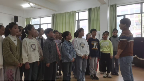 排練現(xiàn)場,張潔老師首先聆聽了孩子們的合唱表演,精準(zhǔn)捕捉到音準(zhǔn)、氣息和聲配合等方面的提升空間。他以通俗易懂的語言拆解專業(yè)樂理知識(shí),通過“基礎(chǔ)發(fā)聲”“打呵欠游戲”等趣味方式,糾正孩子們的發(fā)聲誤區(qū),指導(dǎo)大家掌握科學(xué)的呼吸方法和發(fā)聲技巧。針對(duì)合唱中的聲部配合問題,老師將孩子們分組練習(xí),耐心調(diào)整聲部平衡,引導(dǎo)大家學(xué)會(huì)傾聽彼此、默契呼應(yīng),讓歌聲更具層次感和感染力。