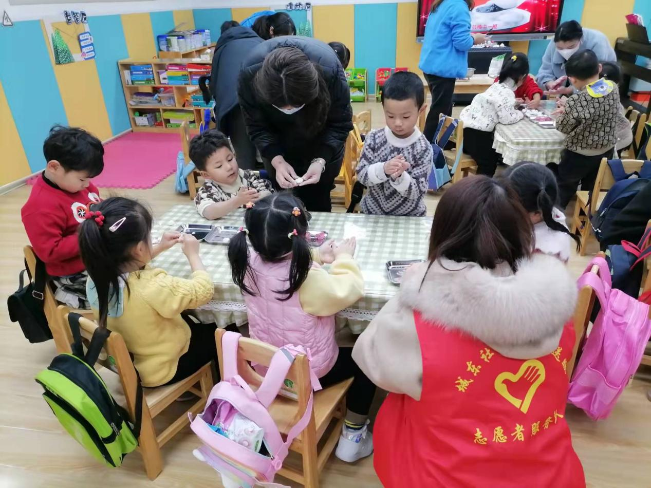 然后是“包湯圓”。今天不僅是元宵佳節(jié),冬奧賽事也正如火如荼的進(jìn)行著,為了給中國的奧運(yùn)健兒們加油助威,老師帶著孩子們用湯圓為原型做起了吉祥物“冰墩墩”和“雪容融”。小朋友在大人的帶領(lǐng)下揉面團(tuán),放餡料,搓捏成型,很快一個(gè)個(gè)雪白活靈活現(xiàn)的吉祥物就裝滿了盒子。緊接著志愿者將煮好的湯圓送給大家品嘗,大家用心制作的元宵,吃起來就是格外香甜。