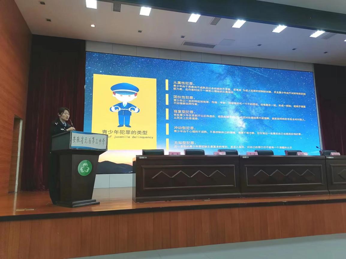 “杜絕校園霸凌”送法進(jìn)學(xué)堂。無(wú)城鎮(zhèn)城北派出所內(nèi)勤辦公室副主任孫方芳同志以校園霸凌為切入點(diǎn),為無(wú)為三中學(xué)生上了一堂法制教育課。課堂上,民警以一個(gè)個(gè)真實(shí)的案例分析了未成年人犯罪的成因及應(yīng)承擔(dān)的后果,教育學(xué)生預(yù)防違法犯罪從抵制不良行為開始,深入淺出、生動(dòng)形象地進(jìn)行了講解。同時(shí)還根據(jù)同學(xué)們的年齡和所接觸的環(huán)境,講解了電信詐騙常見(jiàn)形式及識(shí)騙、防騙技能。
