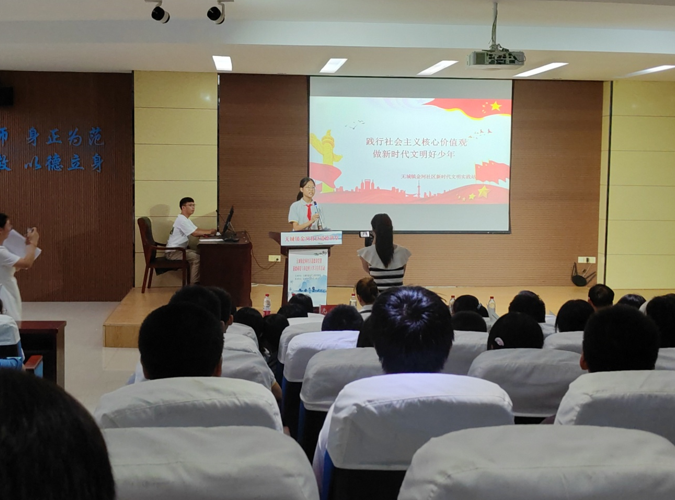 活動中,主持人向現(xiàn)場的全體同學(xué)講述身邊的先進事跡,通過身邊的好人好事來教育學(xué)生深刻領(lǐng)悟社會主義核心價值觀的豐富內(nèi)涵,養(yǎng)成良好的道德行為規(guī)范,既要做中華傳統(tǒng)美德的傳承者,也要做以“富強、民主、文明、和諧;自由、平等、公正、法治;愛國、敬業(yè)、誠信、友善”為基本內(nèi)容的社會主義核心價值觀的小小踐行者,爭做新時代文明好少年。