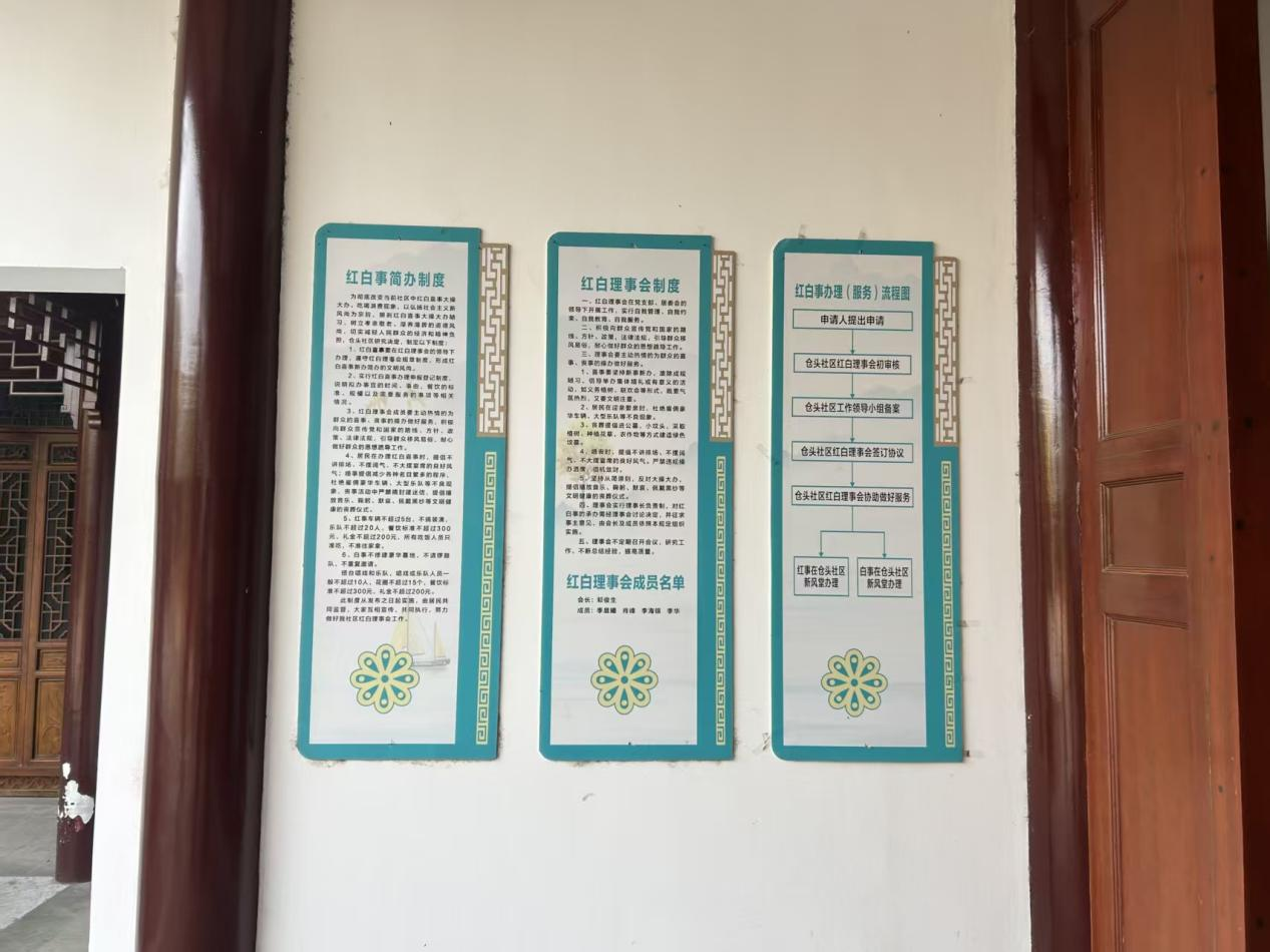 倉頭社區(qū)的紅白事制度牌清晰呈現(xiàn)“簡(jiǎn)辦”準(zhǔn)則,從宴席規(guī)模到禮金數(shù)額,條條框框?yàn)榧t白事操辦劃定文明邊界;紅白理事會(huì)流程規(guī)范,讓居民辦事有章可循。社區(qū)里的家風(fēng)家訓(xùn)展示,季氏“孝親敬長”、聊氏“遵行規(guī)矩”等各姓家風(fēng),如涓涓細(xì)流浸潤人心,讓居民在操辦紅白事時(shí),從比拼排場(chǎng)轉(zhuǎn)向傳承孝道、珍視親情。