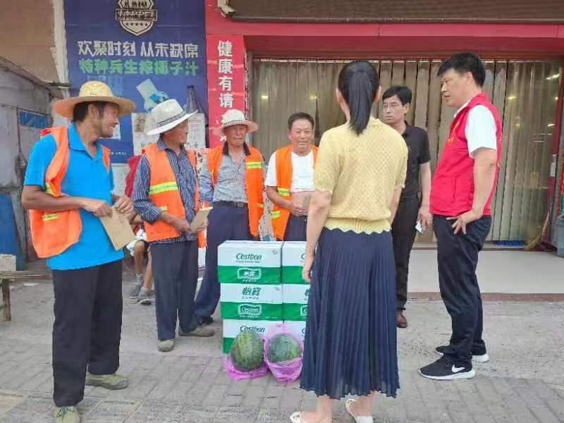 夏日炎炎,烈日當(dāng)空。在集鎮(zhèn)依然頂著烈日、揮汗如雨,無(wú)怨無(wú)悔地堅(jiān)守崗位,他們就是最可愛(ài)、最可敬的環(huán)衛(wèi)工人和執(zhí)法大隊(duì)工作人員。環(huán)衛(wèi)工人每日起早貪黑清掃垃圾、清洗垃圾桶、清運(yùn)垃圾、灑水降塵,用實(shí)際行動(dòng)提升集鎮(zhèn)人居環(huán)境,執(zhí)法大隊(duì)工作人員每天在工作崗位上維護(hù)市容管理秩序,進(jìn)一步增強(qiáng)廣大群眾的獲得感、安全感、幸福感。為表達(dá)對(duì)一線(xiàn)環(huán)衛(wèi)工人、執(zhí)法大隊(duì)的真情關(guān)愛(ài),石澗鎮(zhèn)7月14日上午9:00在集鎮(zhèn)開(kāi)展“ 夏日送清涼”慰問(wèn)活動(dòng),為我鎮(zhèn)夏季