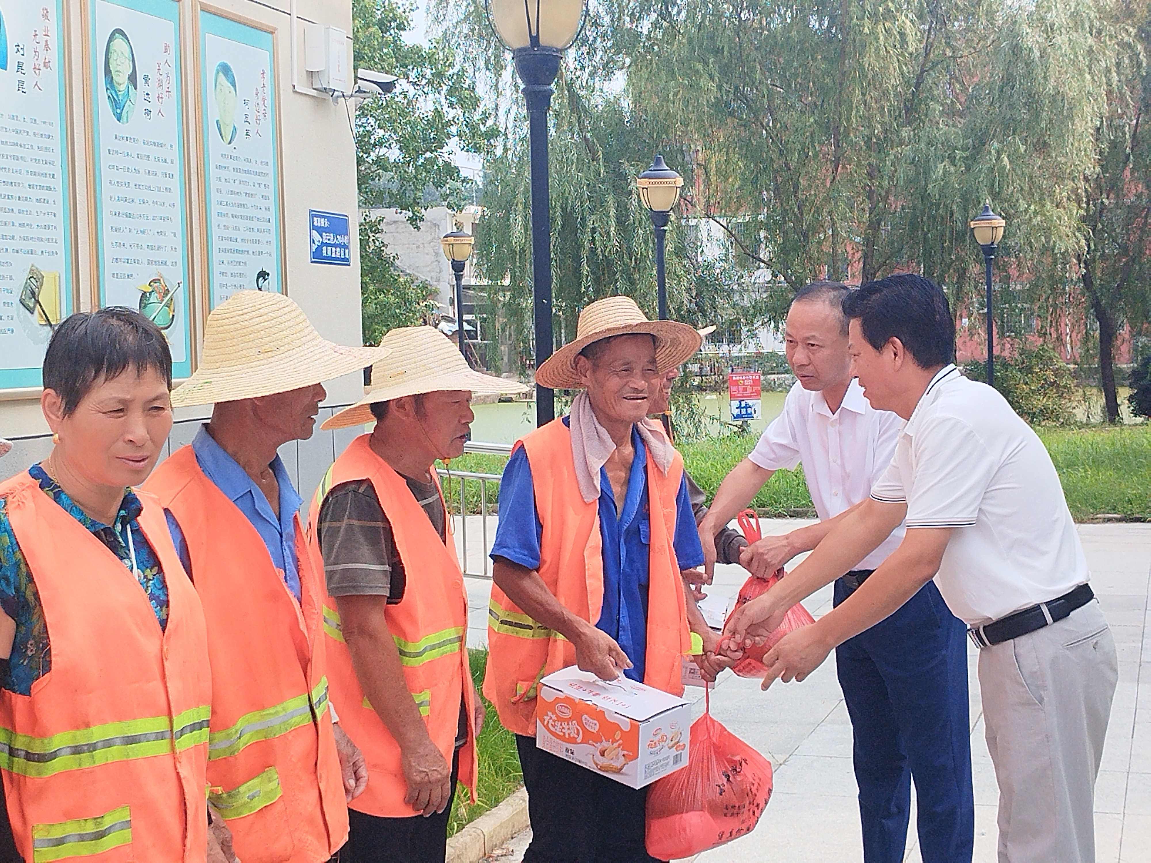 “大家辛苦了!天氣炎熱,你們要注意防暑降溫?!辨?zhèn)黨委書記汪平所與環(huán)衛(wèi)工人親切交流,代表鎮(zhèn)黨委、政府向環(huán)衛(wèi)工人表示深深的謝意,感謝他們?yōu)橐湘?zhèn)環(huán)境衛(wèi)生的付出的辛勤勞動,叮囑大家要合理調(diào)整工作時間,避免在高溫時間段作業(yè)以防中暑。最后,汪書記為各位環(huán)衛(wèi)工人一一送上牛奶、綠豆等慰問品。