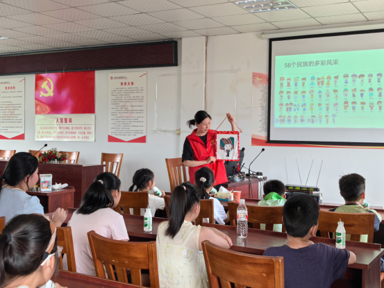 活動現(xiàn)場,志愿者站在講臺上給孩子們講授中華民族傳統(tǒng)文化知識,通過特色圖片展示、生動形象的案例講解,觀看民族團結知識科普短片,讓孩子們了解56個民族文化特色、傳統(tǒng)習俗等,感受民族文化的魅力,引導學生們尊重各民族差異、接納多元文化,互相學習,團結進步。