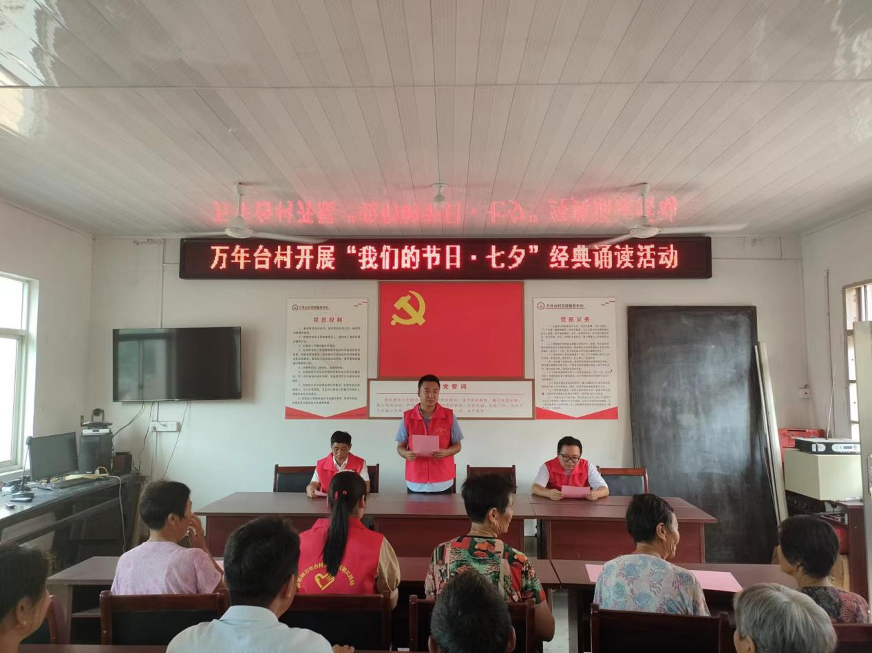 七夕節(jié)將至,為弘揚(yáng)中華民族傳統(tǒng)文化,增進(jìn)大家對(duì)傳統(tǒng)節(jié)日的了解。8月3日下午,萬年臺(tái)村組織新時(shí)代文明實(shí)踐站志愿者及村民共計(jì)十余人開展“我們的節(jié)日·七夕”經(jīng)典誦讀活動(dòng)。