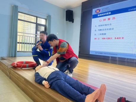 實(shí)戰(zhàn)演練授技能,急救教學(xué)提升應(yīng)對(duì)能力。隨后,無(wú)為市藍(lán)天救援隊(duì)隊(duì)員走上講臺(tái),圍繞“如何預(yù)防溺水”“遇到溺水情況如何正確施救”等內(nèi)容展開(kāi)深入講解。他們不僅傳授了科學(xué)的防溺水知識(shí),還在現(xiàn)場(chǎng)模擬溺水場(chǎng)景,為大家示范心肺復(fù)蘇、海姆立克急救法等實(shí)用急救技能。從判斷患者意識(shí)、調(diào)整施救姿勢(shì),到進(jìn)行胸外按壓、人工呼吸,每一個(gè)動(dòng)作都細(xì)致規(guī)范。社區(qū)工作人員紛紛上前,在救援隊(duì)隊(duì)員的指導(dǎo)下親自實(shí)踐操作,通過(guò)“手把手”教學(xué),切實(shí)掌握了關(guān)鍵的急救要領(lǐng)。