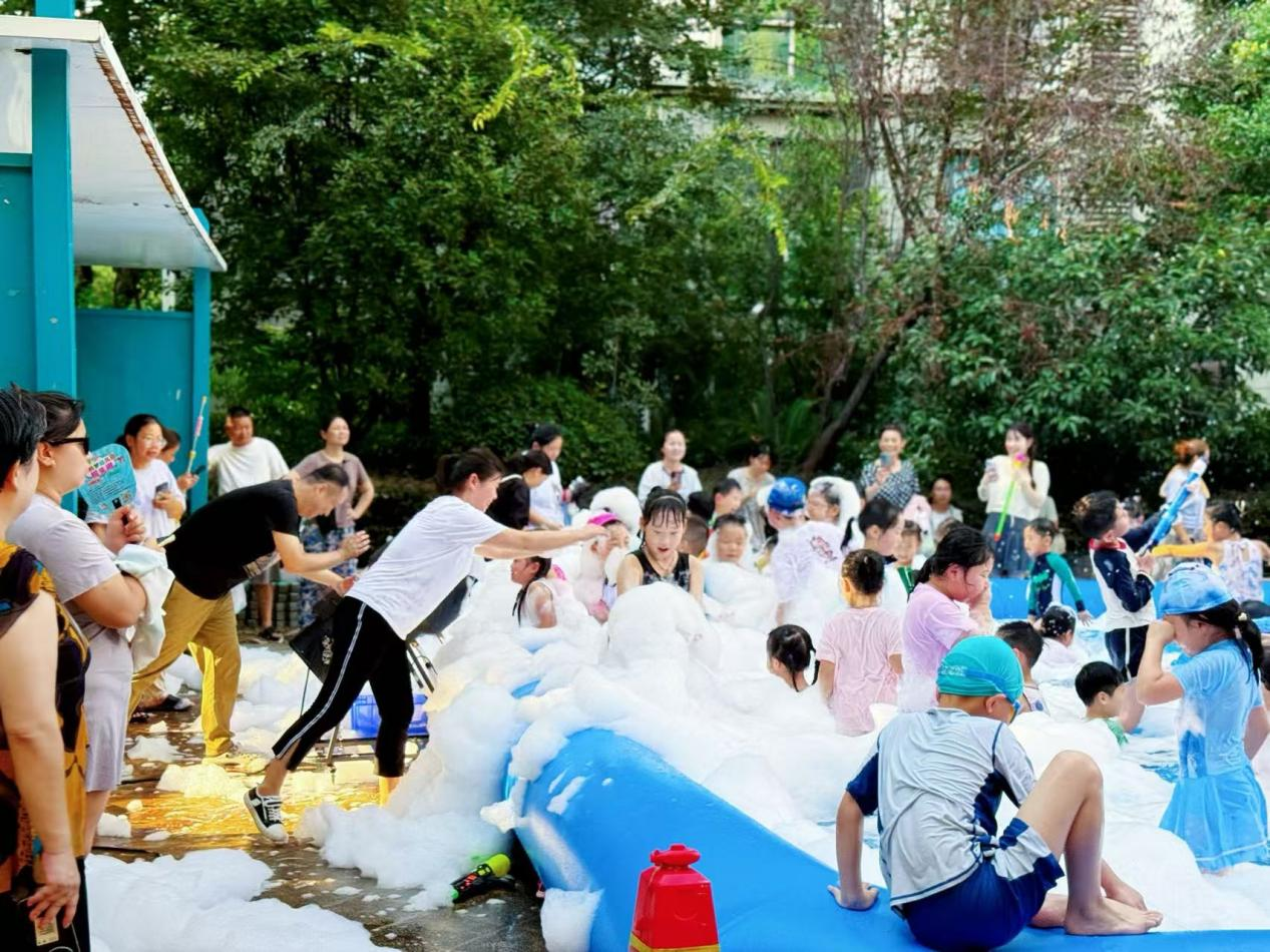 活動現(xiàn)場樂翻天,貼心服務(wù)不停歇。隨著音樂響起,孩子們迫不及待地踏入嬉水區(qū),水槍“對戰(zhàn)”、泡泡派對等項目輪番上演,水花飛濺中滿是童真笑語。家長們在一旁看護(hù),不時被孩子們的歡樂感染,加入互動行列。物業(yè)工作人員穿梭在人群中,及時為孩子們補(bǔ)充飲用水,幫家長照看物品,提醒大家注意安全,忙而不亂的身影成為現(xiàn)場一道暖心風(fēng)景線。