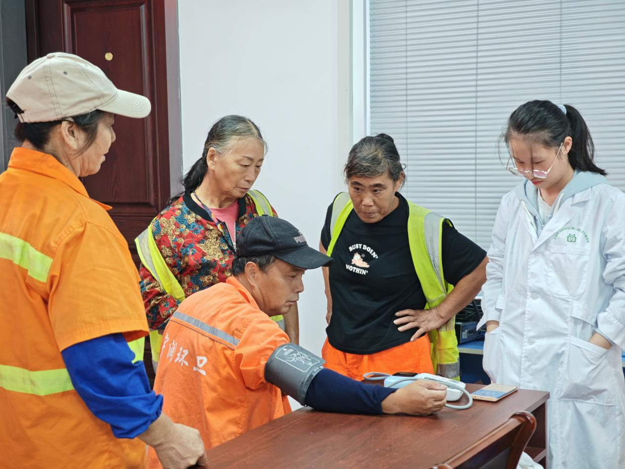 健康講座結(jié)束后,義診環(huán)節(jié)隨即拉開帷幕。社區(qū)衛(wèi)生服務(wù)站的醫(yī)生為環(huán)衛(wèi)工人提供了免費的血壓測量、血糖檢測,以及內(nèi)外科咨詢等服務(wù)。醫(yī)護人員耐心細致地為環(huán)衛(wèi)工人進行檢查,詳細詢問他們的身體狀況和用藥情況,并根據(jù)檢查結(jié)果給出個性化的健康建議。