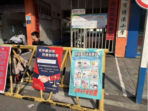 從社區(qū)公告欄到學(xué)校門口的隔離欄,從電線桿到居民樓墻體,印有“積極參與平安建設(shè)”“有矛盾糾紛找綜治中心”的海報、橫幅隨處可見:海報以漫畫形式科普交通安全、消防安全、防詐騙等知識,生動易懂;綜治中心宣傳頁則明確了矛盾調(diào)解、法律咨詢等服務(wù)內(nèi)容,并標(biāo)注了聯(lián)系電話,方便居民求助。在錦繡溪小學(xué)附近,宣傳物料與校園環(huán)境融合,既提醒家長關(guān)注安全,也向?qū)W生傳遞平安理念。