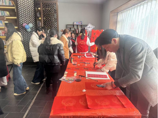 活動(dòng)現(xiàn)場(chǎng)人頭攢動(dòng),年味濃郁。社區(qū)特邀書畫院的書法老師們飽蘸濃墨,揮毫潑墨。居民們圍站桌旁,有的駐足挑選心儀聯(lián)作,有的主動(dòng)執(zhí)筆書寫,墨香裹挾著年味,在現(xiàn)場(chǎng)緩緩流淌?!坝H手寫的對(duì)聯(lián)貼上門,才是最地道的年味兒!”居民李大姐握著剛寫好的“?!弊?,眉眼間滿是歡喜,還不忘向身邊鄰居分享書寫心得,現(xiàn)場(chǎng)歡聲笑語(yǔ)不斷。