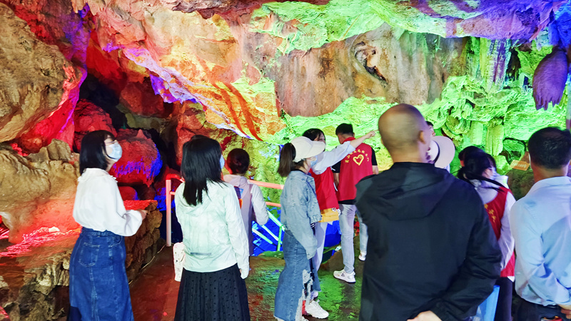 宣講結束后志愿者帶領大家前往景區(qū)內(nèi)進行參觀。游客們依次進入到形成于二億四千萬年前的古老石灰?guī)r溶洞中,洞道高低起伏,幽邃曲折,時而狹窄崎嶇,時而宏大開闊,洞中的鐘乳石千姿百態(tài),晶瑩剔透,志愿者詳細地講解著洞中的奇景,尤其是洞中的石枝、石旗、石花、石柱等精美絕倫,大家在數(shù)不勝數(shù)的奇觀美景中不禁發(fā)出陣陣贊嘆。