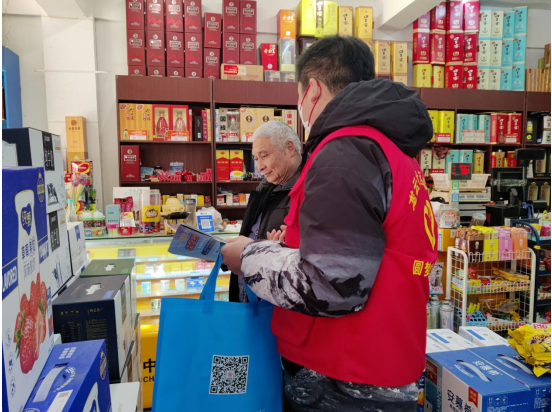 圖為龍云社區(qū)志愿者向商戶宣傳就業(yè)政策